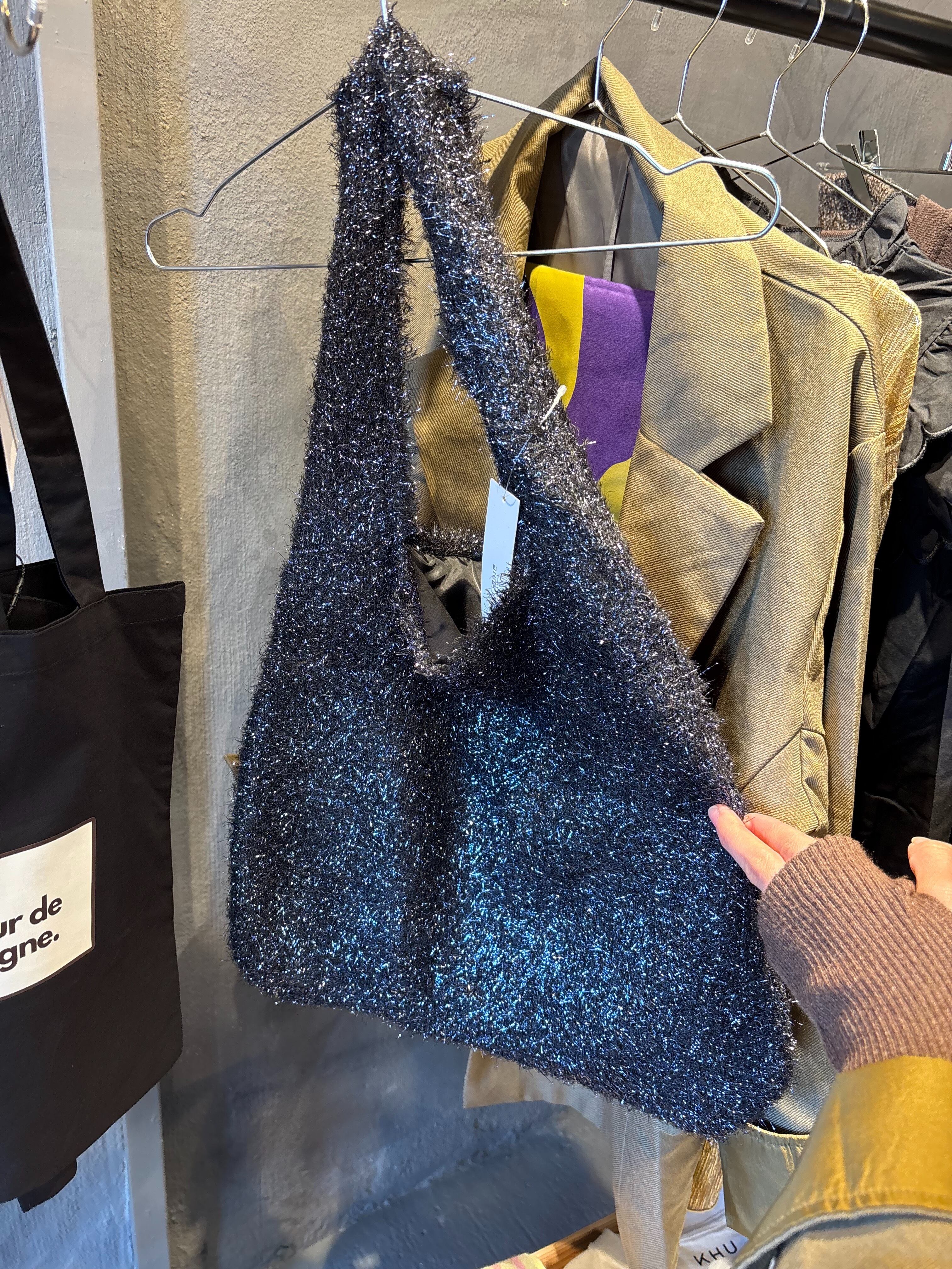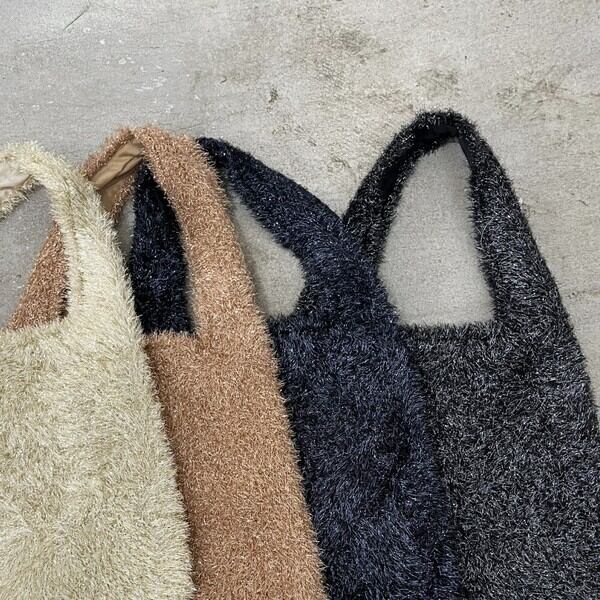 光沢感が今年らしいラメフェザーニット素材のバッグ。
