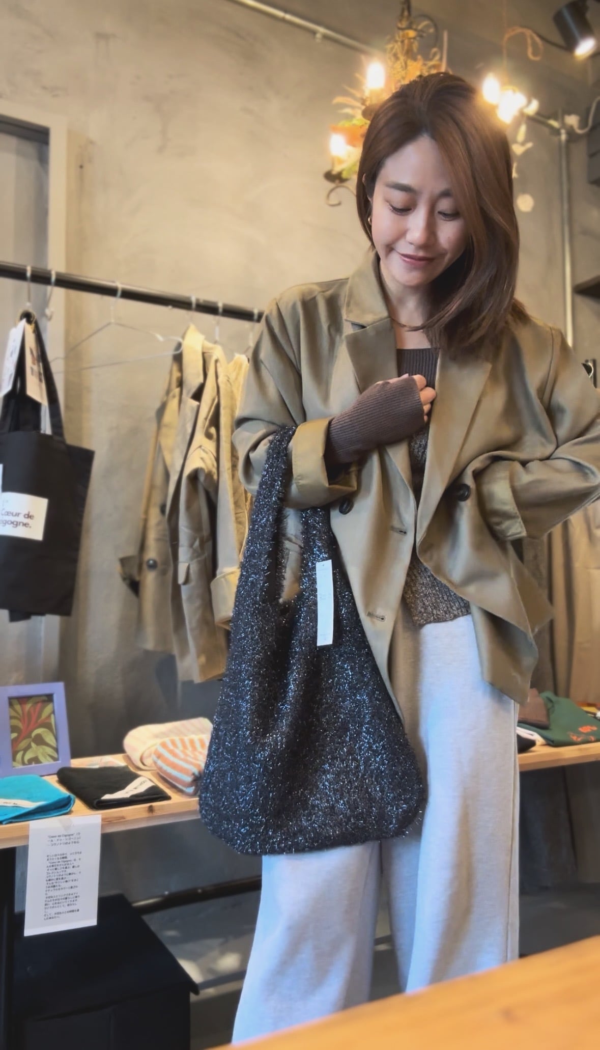 パーティスタイルにもおすすめで、裏地つきなので荷物をいれても伸びにくい仕様になっています。
